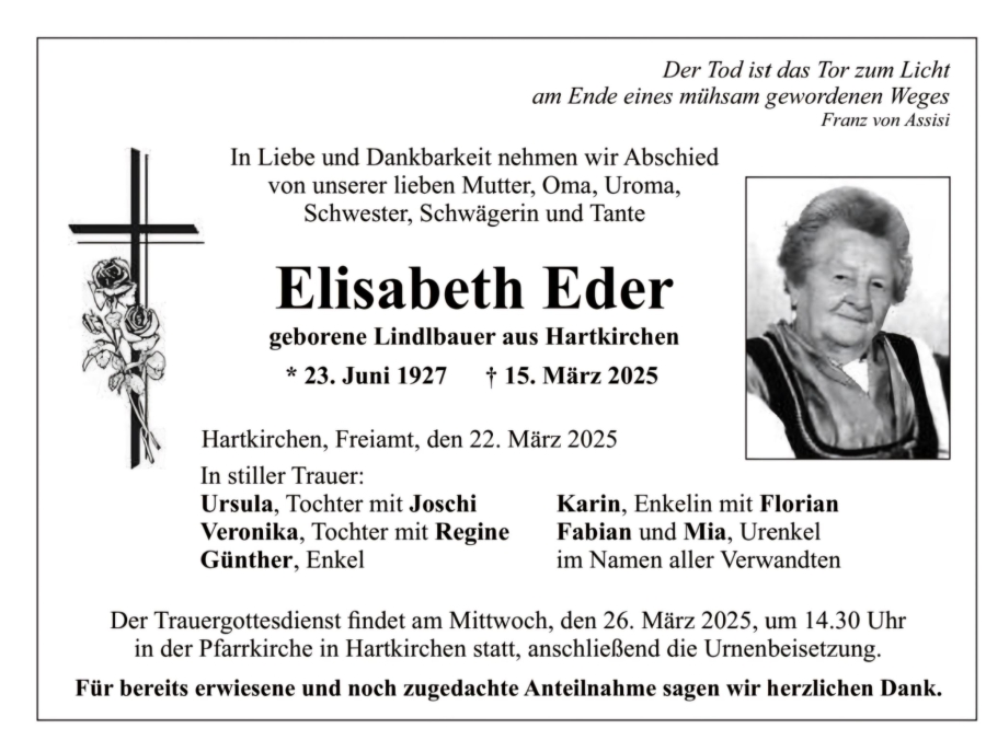 Trachtenverein Hartkirchen trauert um sein letztes Gründungs- und Ehrenmitglied Elisabeth Eder