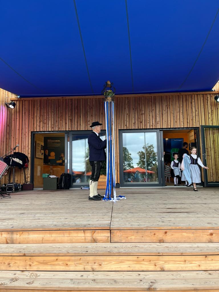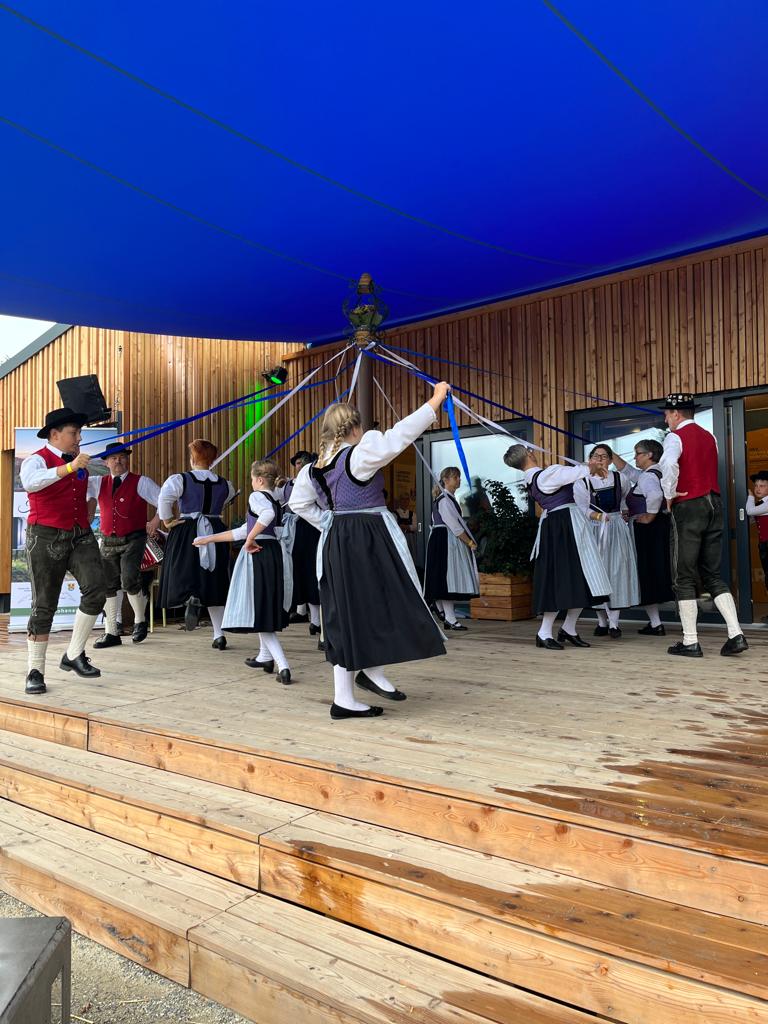 Für den „Böhmischen Traum“ u. andere Musikstücke sammelte Josef Küblböck riesigen Beifall ein. Den Abschluss bildete dann der Bandltanz, bei dem mit weiß-blauen Bändern zunächst das bayerische Rautenmuster und dann ein Netz geflochten wird.